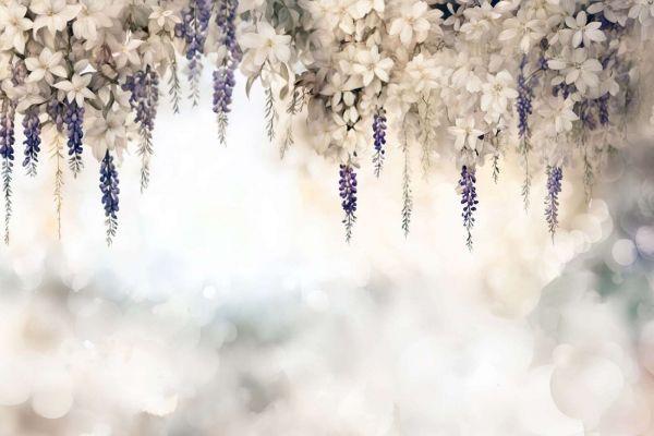 Un design incantevole con eleganti fiori bianchi di gelsomino e glicine viola pendente. Lo sfondo morbido ad acquerello e le sottili riflessioni di luce creano un'atmosfera da sogno e romantica. I delicati fiori e le linee fluide portano un tocco di eleganza e tranquillità in ogni ambiente.