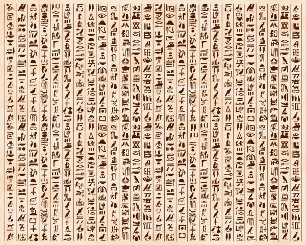 Illustrazione piena di geroglifici su sfondo chiaro.