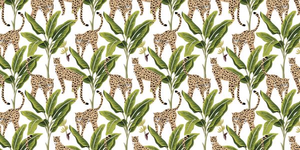 Alberi di banane tropicali e ghepardi su uno sfondo bianco.