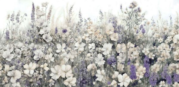 Un campo di fiori da sogno con delicate fiori bianchi e lilla che sfumano dolcemente in uno sfondo nebbioso. Le sottili transizioni di colore e i dettagli raffinati creano un'atmosfera romantica e rilassante, perfetta per un aspetto sereno ed elegante.