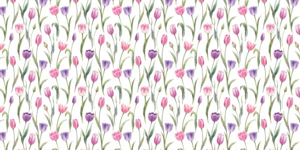 Una collezione raffinata di tulipani, realizzata in tonalità acquerello di rosa tenue e viola profondo, si dispiega su uno sfondo luminoso. L'eleganza naturale dei fiori è catturata con cura, con pennellate che evidenziano le transizioni delicate e le forme fluide delle foglie di tulipano.