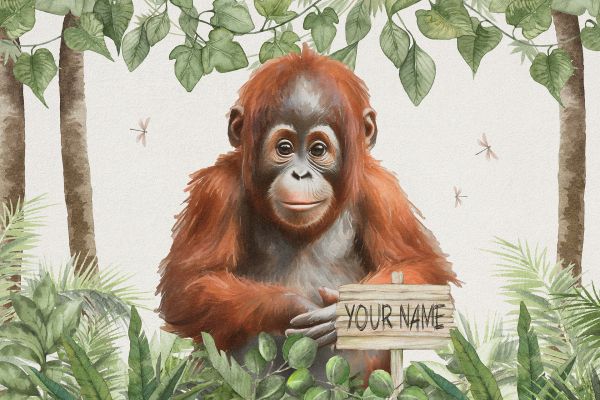 L'effigie di un orango dalla morbida pelliccia rosso ruggine e dal volto espressivo è calda e invitante. Lo sfondo arioso, punteggiato da diverse tonalità di foglie verdi e libellule fluttuanti, dà la sensazione di una giornata rilassante nella foresta tropicale.