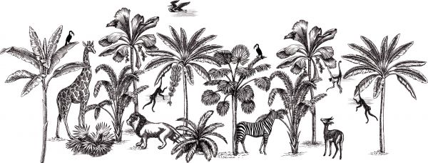 Una vera e propria giungla animale composta da leoni, giraffe, scimmie, cervi e molto altro. Carta da parati trendy e alla moda.