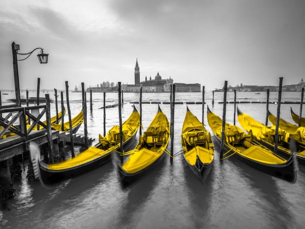 Gondole ormeggiate lungo il canale di Venezia, Italia. La foto è in bianco e nero con un effetto giallo sulle gondole.