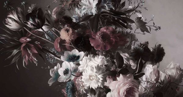 Un decor floreale lussureggiante ispirato ai classici nature morte, con tonalità di ruggine profonde, morbidi colori crema e sfumature di verde attenuate. Lo sfondo scuro crea un contrasto drammatico, facendo sembrare i fiori quasi tangibili e dando vita a un aspetto lussuoso e senza tempo.