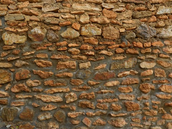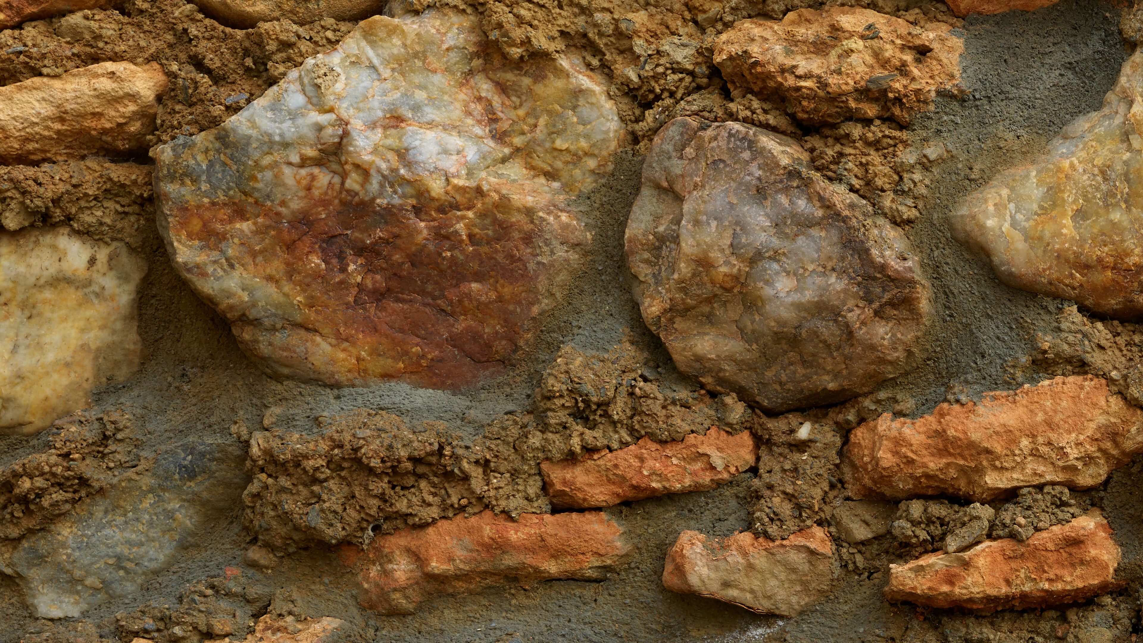 Grande parete con pietre grezze di diverse dimensioni in diversi materiali