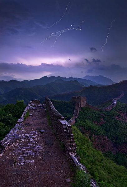 Sfondo fotografico della Grande Muraglia. Un temporale sullo sfondo rende l'immagine spettacolare.