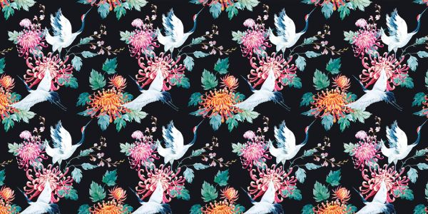 Gru e fiori ad acquerello. Combinate questa carta da parati nel vostro salotto o camera da letto.