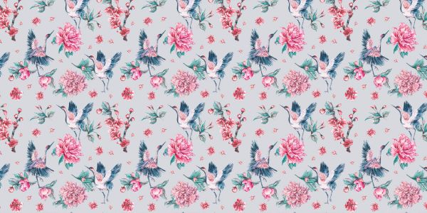 Gru felici ai fiori rosa. Carta da parati ideale per la stanza dei bambini.