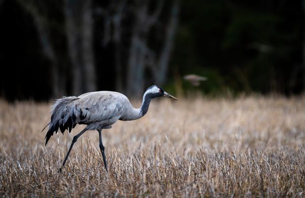 Una gru che cammina in un campo deserto. La gru cammina alla ricerca.