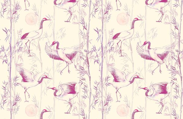 Gru e bambù. Questa stampa è fatta con acquerello e ha sfumature rosa.