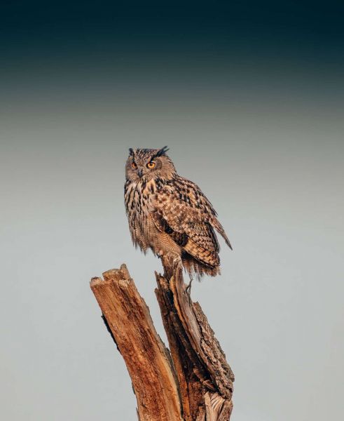 Gufo su un ceppo d'albero guarda in lontananza. Il gradiente dello sfondo, da chiaro a scuro, contrasta piacevolmente con gli occhi arancioni e luminosi del gufo.