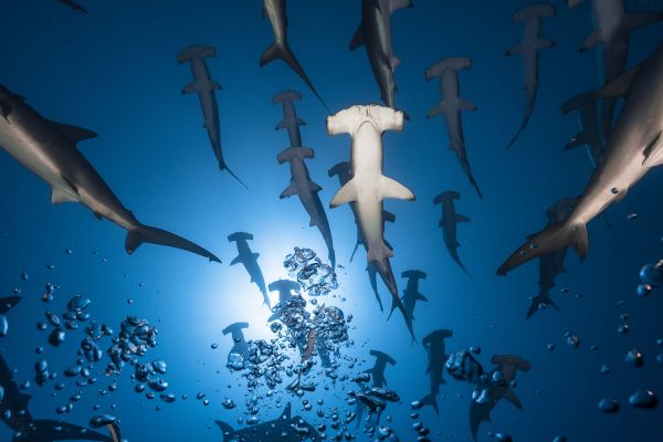 Un gruppo di squali martello che nuota pacificamente insieme.
