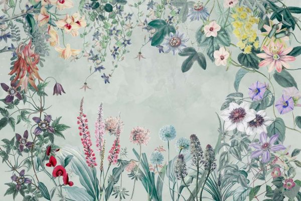 Este diseño irradia una belleza encantadora a través de una mezcla armoniosa de flores y plantas, que refleja elegancia y alegría. Los ricos detalles en las hojas y flores, combinados con una sutil paleta de colores pastel y suaves tonos tierra, lo hacen vivo y refinado. La elegante composición crea una atmósfera acogedora, perfecta para espacios que requieren una apariencia tranquila y natural.