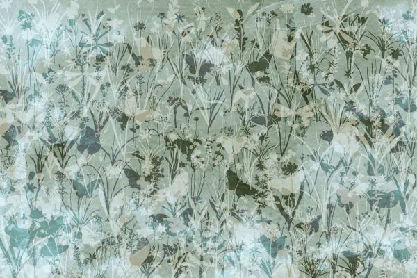 Un delicado diseño en el que mariposas y flores herbáceas se unen en un juego de capas de suaves tonos pastel. La sutil silueta de la flora y la fauna crea una atmósfera serena y atemporal.