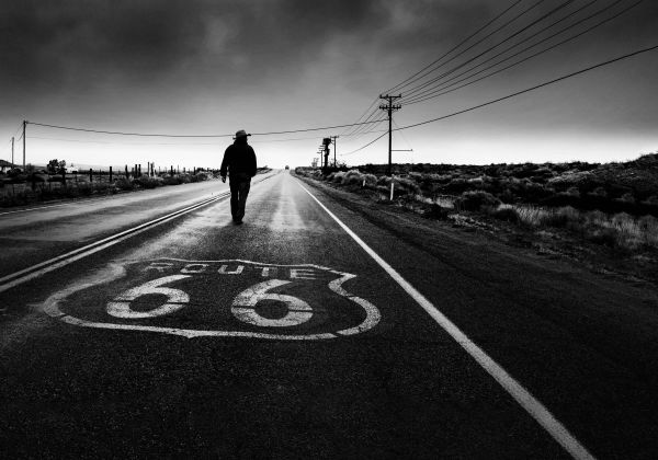 Questa vecchia strada si trova in mezzo a un deserto, il che dà un bell'effetto. L'immagine è in bianco e nero.
