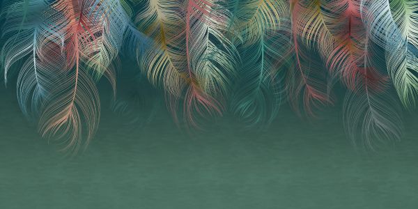 Hojas de palmera de diferentes colores sobre un fondo verde oscuro.