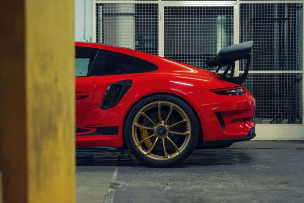 Una dettagliata close-up della Porsche 911 GT3 RS, con il retro che attira l'attenzione grazie al grande spoiler e ai cerchi dorati. La vernice rossa e i dettagli aerodinamici mettono in risalto il puro DNA da corsa di questa sportiva, pronta a offrire potenza e velocità.