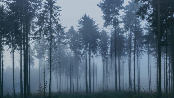 Un paesaggio nebbioso e grigio pieno di alberi alti.