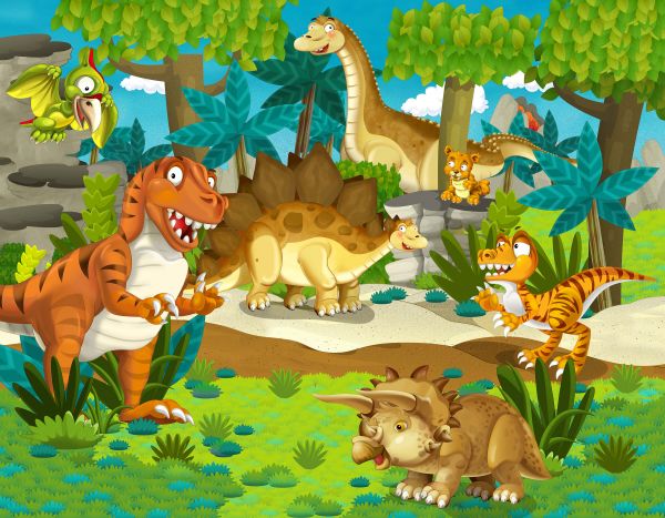 Carta da parati con immagine della terra dei dinosauri. Da abbinare alla camera dei bambini per creare un'atmosfera divertente.