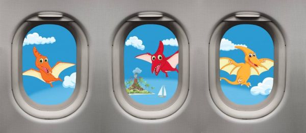 Carta da parati con dinosauri volanti dietro i finestrini degli aerei