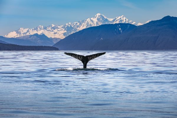 Immersione di balene con le montagne sullo sfondo in diversi materiali
