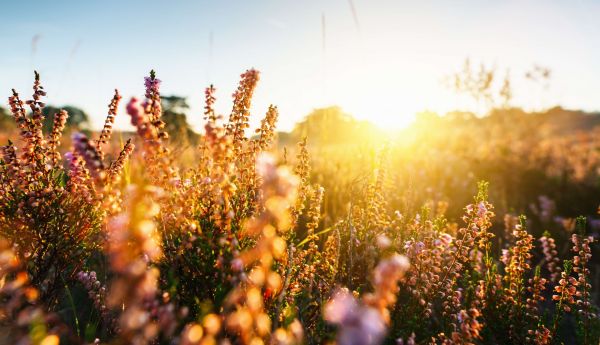 Primo piano di una pianta di erica su un campo di erica. Sullo sfondo vediamo un sole al tramonto.