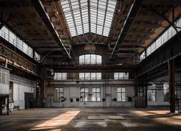 Fotobehang met een verlaten oude industriële hal met een prachtig daklicht en veel ramen aan de binnenzijde.