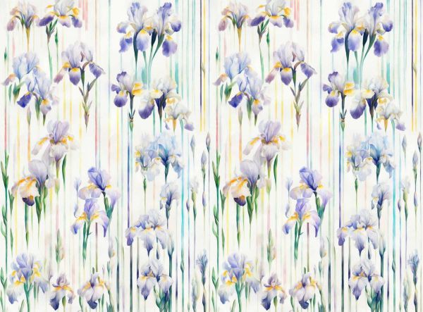 Iris eleganti in morbide tonalità di lilla, blu e giallo prendono vita su uno sfondo chiaro. Le raffinate pennellate e i sottili effetti acquerello conferiscono un aspetto sognante ed elegante. Accenti di colore verticali in pastello creano un insieme giocoso e leggero.