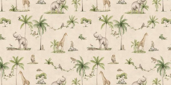 Un allegro motivo jungle con animali esotici come elefanti, giraffe, leoni e leopardi, tra palme e fogliame verde. Lo sfondo chiaro e le illustrazioni dettagliate creano un'atmosfera giocosa e leggera, ideale per aggiungere un tocco avventuroso a qualsiasi ambiente.
