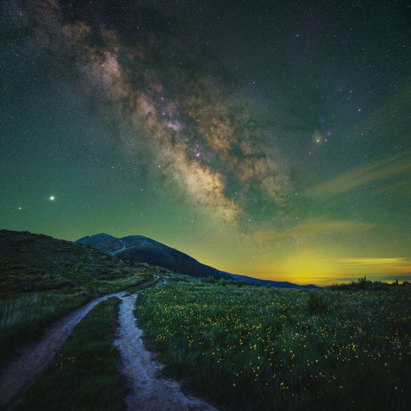 Un paesaggio di montagna di notte con un bel cielo stellato. Nel prato ci sono fiori gialli.
