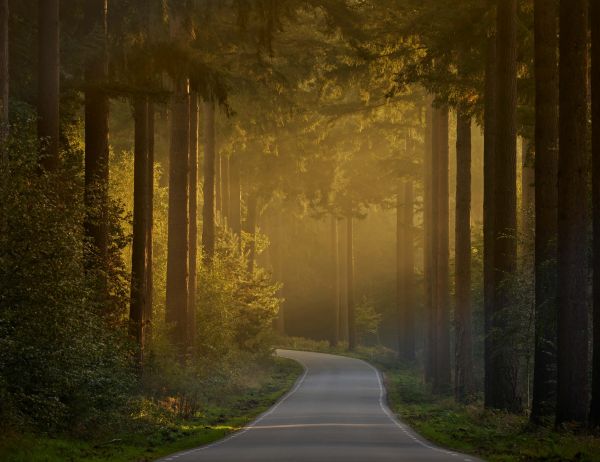 Carta da parati - L'alba sulla strada attraverso la foresta