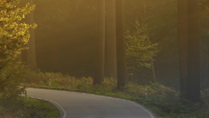 L'alba sulla strada attraverso la foresta