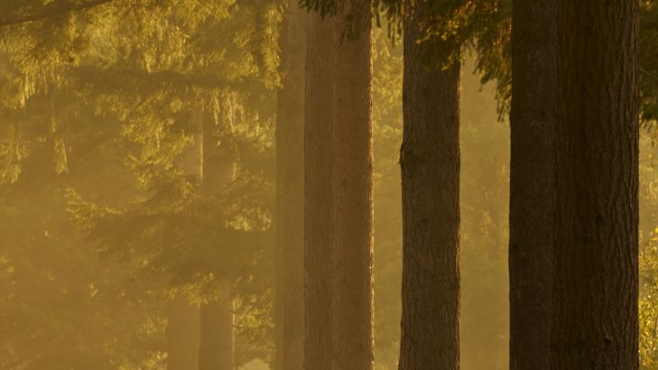 Foresta splendidamente illuminata lungo una strada all'alba