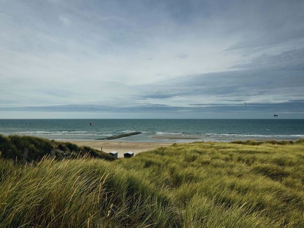 Vista della spiaggia dalle dune con casette e kite surfisti. Portate la spiaggia in casa vostra con questo sfondo fotografico.