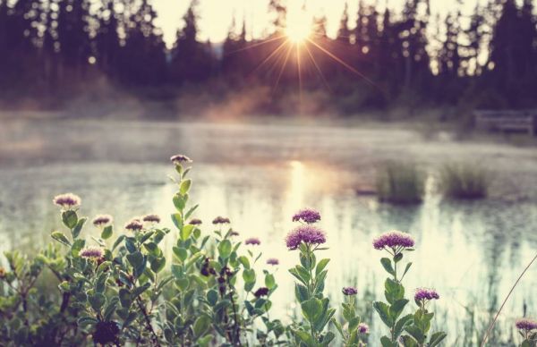 Un lago fumante con fiori in primo piano. Sullo sfondo, un sole che sorge tra gli alberi. Bello svegliarsi a