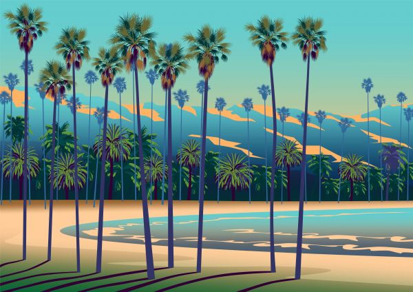 Illustrato lago aperto con palme e montagne sullo sfondo.