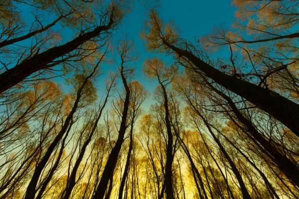 Sfondo fotografico della vista dal basso dell'alba tra alberi ad alto fusto