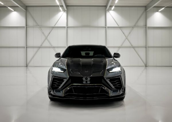 Una potente foto di una Lamborghini Urus Mansory in un corridoio bianco.
