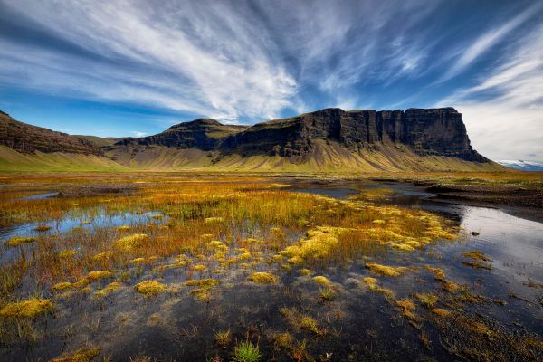 Una foto estiva di un lago invaso dalla vegetazione con un'alta scogliera sullo sfondo.