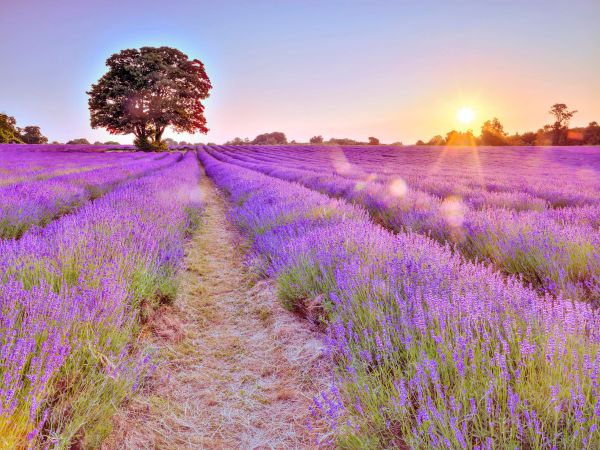 I primi raggi del sole immergono il campo di lavanda in una luce calda, mentre il maestoso albero veglia sul paesaggio colorato. La distesa serena invita al riposo e alla contemplazione nelle prime ore del mattino.