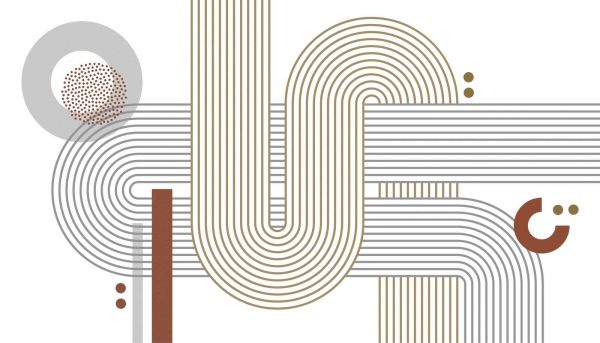 Questo disegno gioca con l'illusione della profondità attraverso la sovrapposizione di strati di linee di diverso spessore. La combinazione di tonalità beige e grigie, insieme ai puntini e ai motivi circolari, dà un'impressione dinamica ma strutturata.
