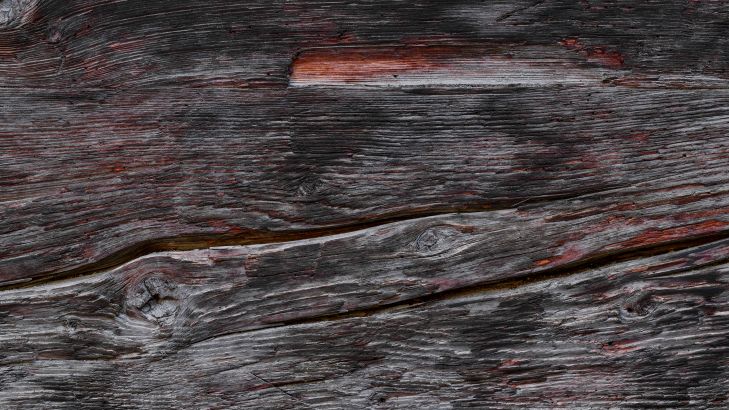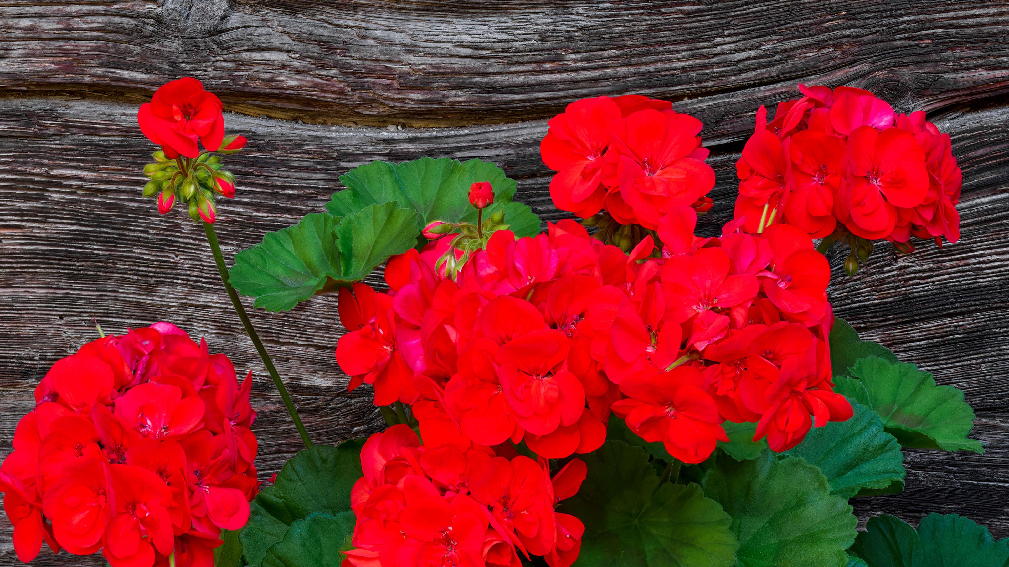 Legno vecchio e rovinato dalle intemperie con fiori rossi. I fiori rossi danno a questa carta da parati fotografica un'atmosfera allegra nella vostra casa.