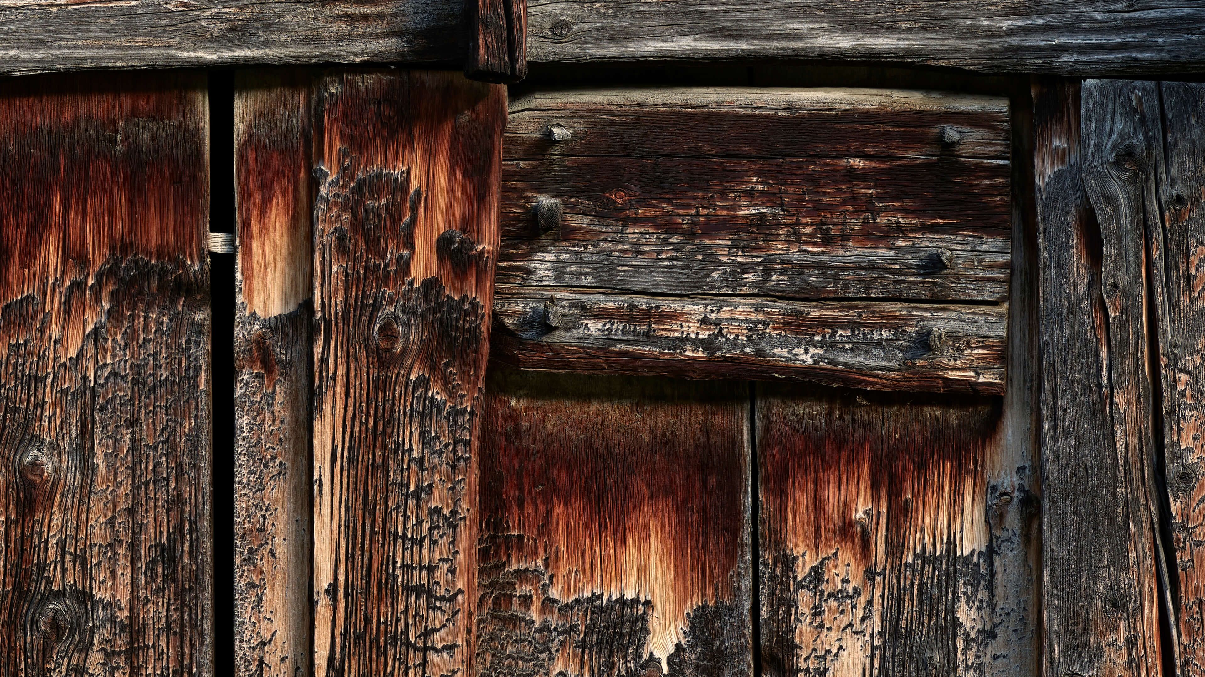 Legno vecchio con travi e una porta. C'è una piccola parte della porta visibile, che fa sembrare che si possa camminare attraverso la porta quando questa carta da parati fotografica è nel soggiorno.