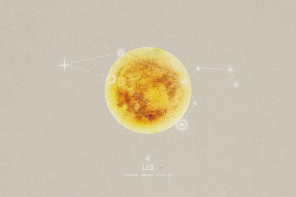 Una radiosa illustrazione ad acquerello del sole in vivaci tonalità di giallo e arancione, incorniciata dal segno zodiacale del Leone. La composizione trasmette calore, potenza e una grandiosità giocosa.