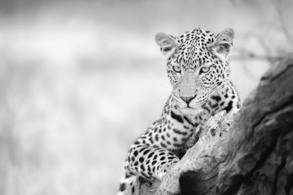 Bella foto in bianco e nero di un leopardo che cerca la sua preda.