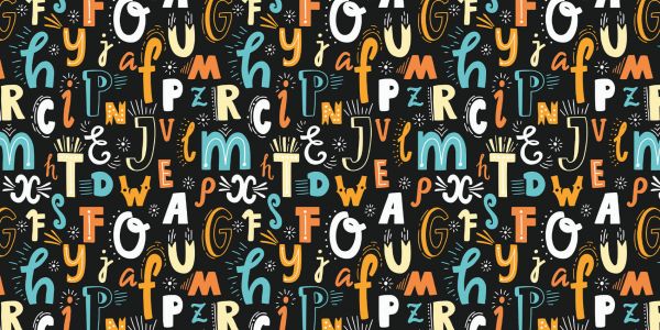 Alfabeto colorato in diversi stili su sfondo scuro.