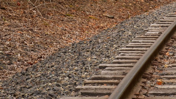 La vecchia linea ferroviaria che si piega a sinistra attraverso il bosco