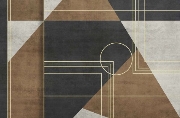 Un gioco geometrico rigoroso di cerchi, linee e superfici in nero, marrone e grigio simile al cemento. Le linee dorate conferiscono un tocco raffinato di art déco, mentre la composizione porta equilibrio e profondità in ogni interno.