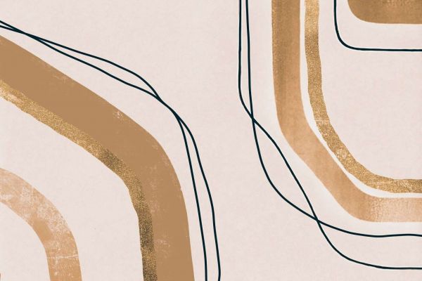 Questo design unisce audaci archi arrotondati in calde tonalità oro e caramello a raffinate linee fluide in un profondo verde scuro. La combinazione di ampie e morbide campiture di colore e di netti accenti lineari crea un contrasto entusiasmante tra robusto e raffinato. La sottile texture nelle tonalità dorate dona una lieve lucentezza, mentre lo sfondo neutro preserva calma ed equilibrio.